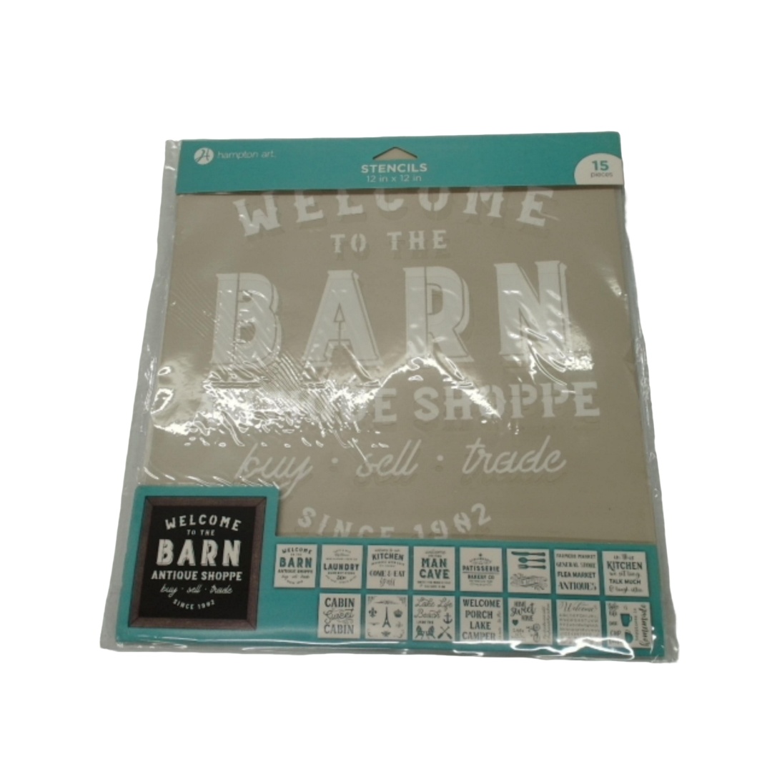 Hampton Art Stencil 12 in. x 12 in. Welcome 15 pc- Create your own home decor sign with this pack of clear plastic stencils. Designs include: silverware ornate edging a bike coffee cups lawn chairs the Eiffel tower a bee and more. Captions include: welcome to the barn antique shoppe laundry welcome to the man cave farmers market general store antiques flea market and more. Also includes a full script alphabet to create your own custom designs. Stencils measure approximately 12 in. x 12 in.