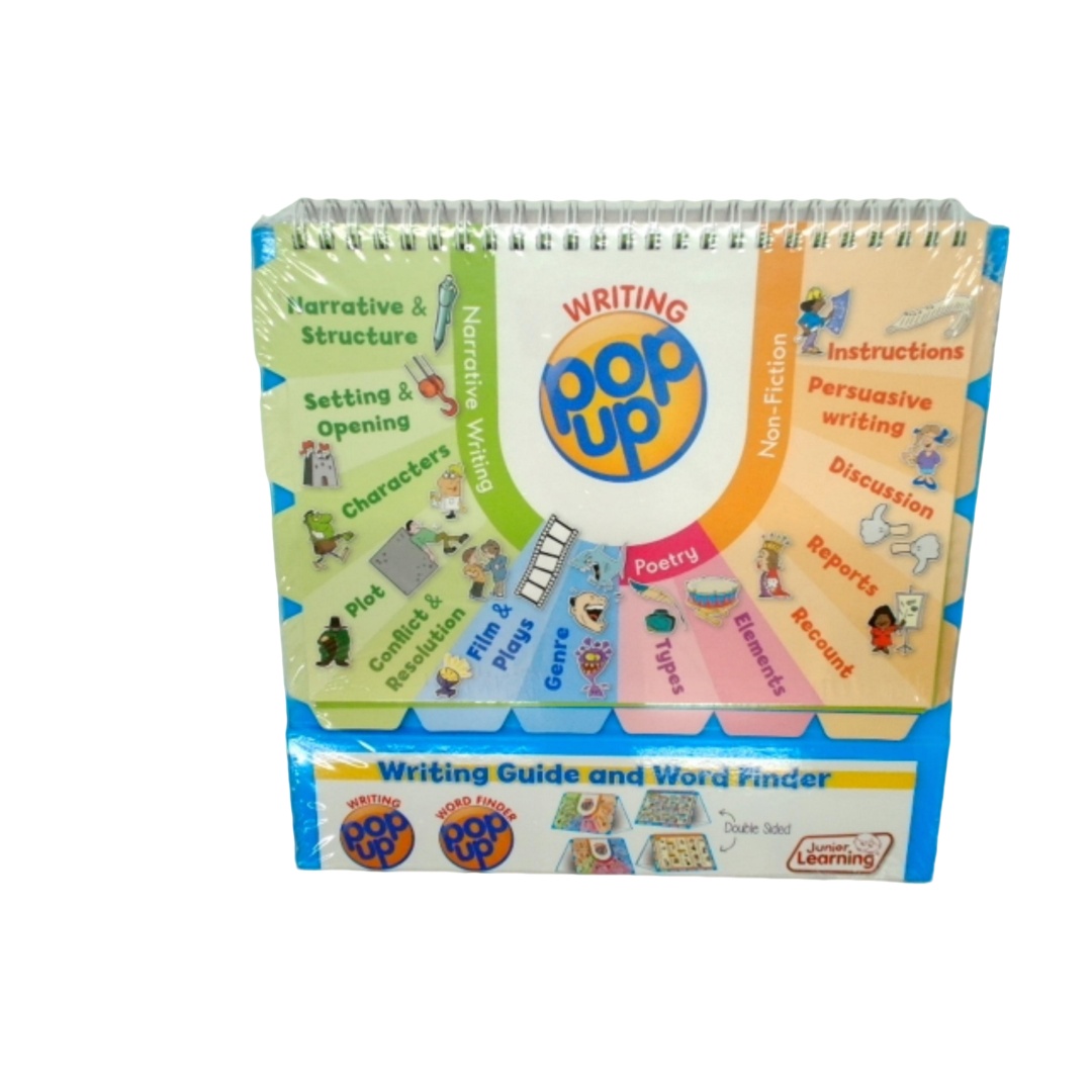 The writing pop up is a a double sided directory with a guide to writing on one side and word finding examples on the other. Visual examples are provided throughout. For children 5 to 9. Can be used for writing instruction or support during writing.