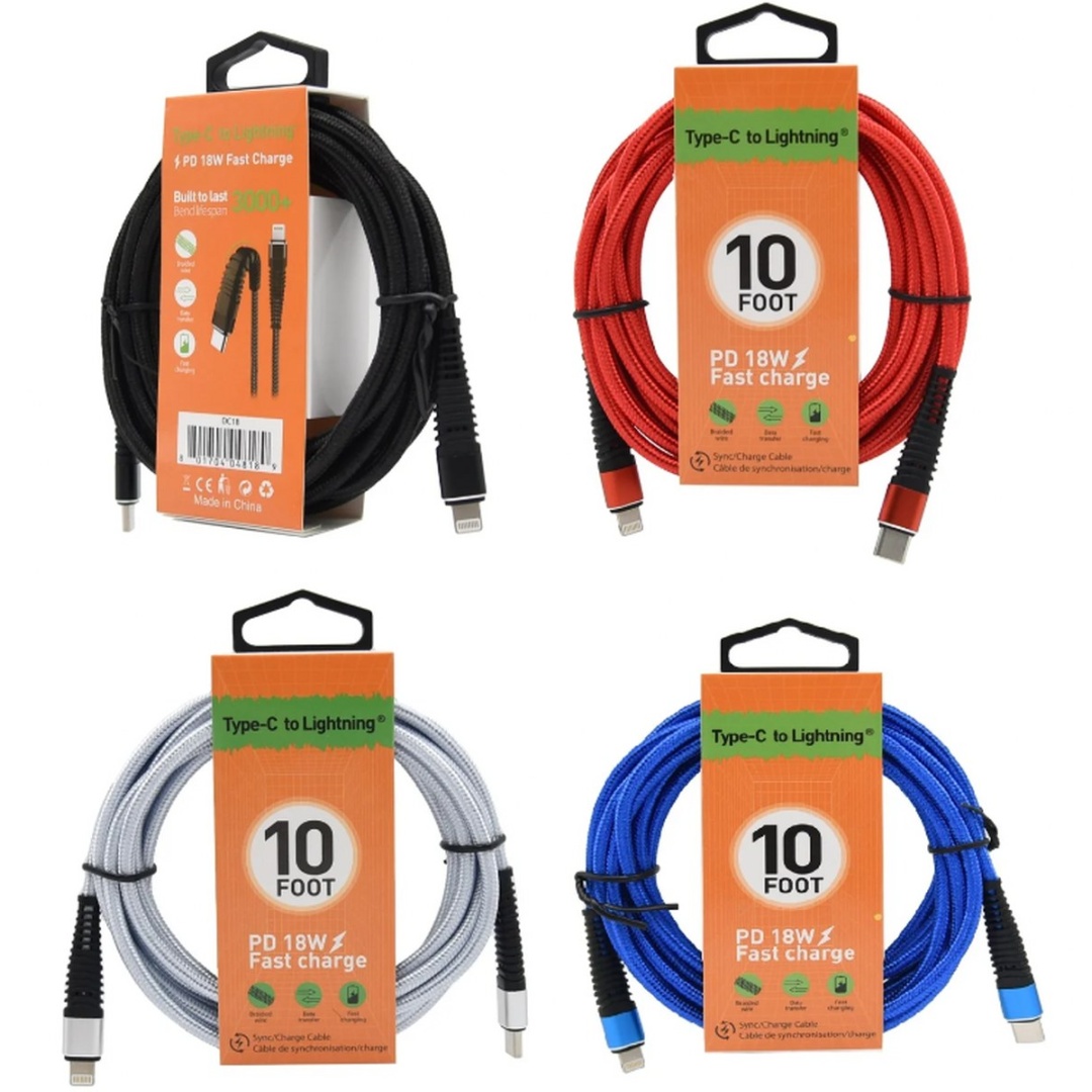 USB C - Lightning 10Ft Braided Cable Ass't Colours