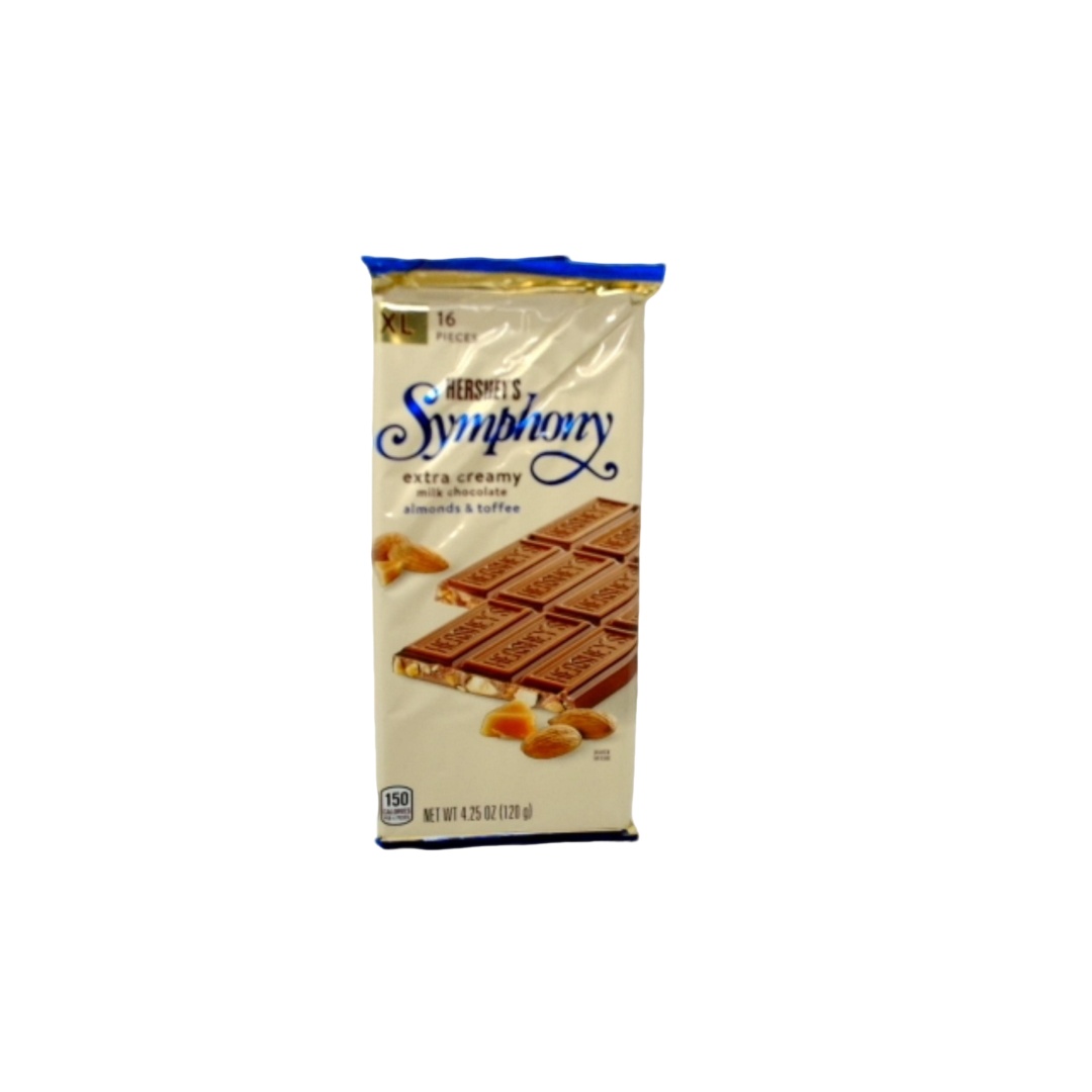 In this HERSHEY S SYMPHONY XL candy bar crunchy almonds rich toffee and smooth extra creamy milk chocolate create the perfect harmony of flavors that you and the entire family are sure to enjoy. Stock up on extra-large bars and you ll always have a decadent treat within reach at home at the office or on the go. HERSHEY S SYMPHONY milk chocolate with toffee and almonds is a delicious chocolate candy to enjoy on your own or share with friends and family members on any given day.