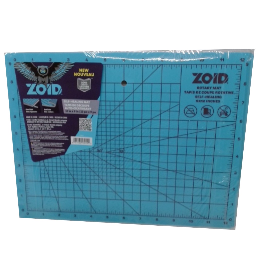 Cut appliques and stencils or fabrics wherever. This 3mm-thick self-healing cutting mat is perfect for smaller spaces or taking on-the-go. This 9? x 12? reversible cutting mat is the perfect size for taking on the go or for smaller projects like cutting appliques and squares. Made of self-healing PVC this durable 3mm-thick cutting mat is designed to work with ZOID? rotary knives keeping the blades sharper for longer. The printed key measuring marks angles and grid guide you while you align measure mark and make your cuts. High-contrast purple and blue sides offer greater visibility when cutting colorful fabrics.