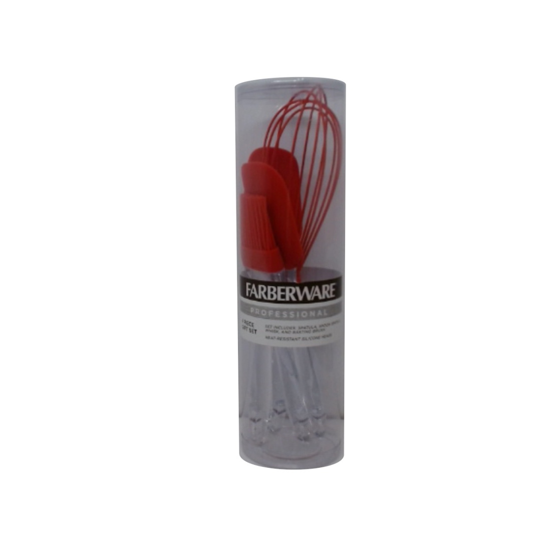 These kitchen utensils are ergonomically designed for ease of use. Heat resistant silicone heads will not break, bend, or melt with everyday cooking. This silicone kitchen utensils set will help protect and prolong your cookware from any scratches.Plastic handle provides a comfortable grip on utensils, without worrying about the handle staining, chipping, or holding moisture. Small hanging hole allows for gadgets to be hung or neatly tucked away in drawer.Set includes 1 whisk, 1 spatula, 1 spoon spatula perfect for scraping batters and using to scrap jars, 1 basting brushAll utensils are dishwasher safe for easy cleanup, simply toss in the dishwasher when ready for cleanup, no handwashing requiredGift set pre-agganged is a great gift for anyone who loves to cook, a house warming party, new college students, or the perfect stocking stufferLimited lifetime warrantyFounded over 100 years ago, Farberware has always stood for value, quality and durability. It's no wonder that they are the best-selling cutlery bra