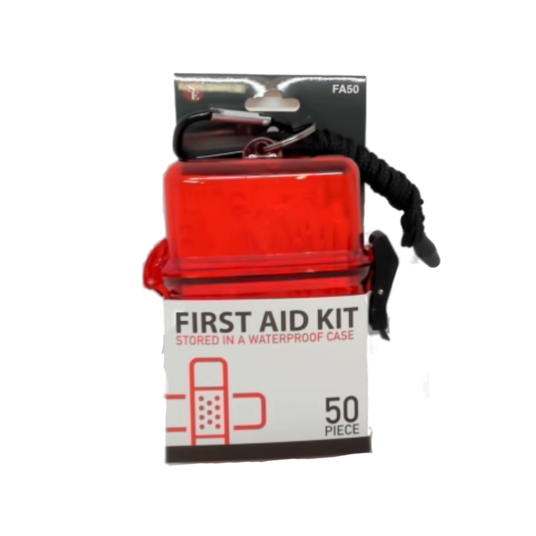 This listing is for ONE (1) 50 Pc First Aid Kit in Waterproof Storage ContainerThe items in the kit are for treating minor cuts and wounds.Includes:Clean2 Alcohol Wipes2 Sting Relief Wipes2 Antiseptic Cleaning Wipes10 Cotton Swabs ? Protect10 Adhesive Bandages: 72 x 19mm10 Adhesive Bandages: 56 x 19mm10 Adhesive Bandages: 40 x 10mm2 Gauze Pads: 2 x 2 - 1 H Bandage1 Waterproof Storage ContainerWith a Lanyard & Carabiner for HangingGreat to keep In your car home office or survival kits