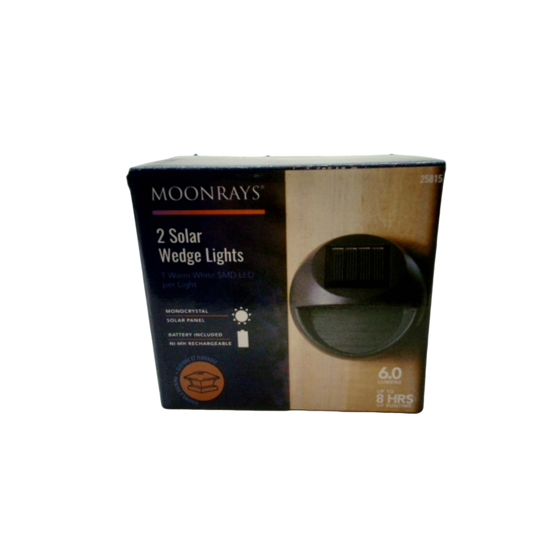 2-pack solar round wedge light. Features a warm white SMD (surface mounted device) LED (light emitting diode) that produces 6 lumens of light output. Includes a polycrystalline solar panel and a rechargeable Ni-MH battery to charge the light using the sun s rays. Up to 8 hours of run time on a full charge. Solar power means there is no need to hassle with power cords and electrical outlets. Ideal to use on decks or fencing to illuminate a desired area. null -