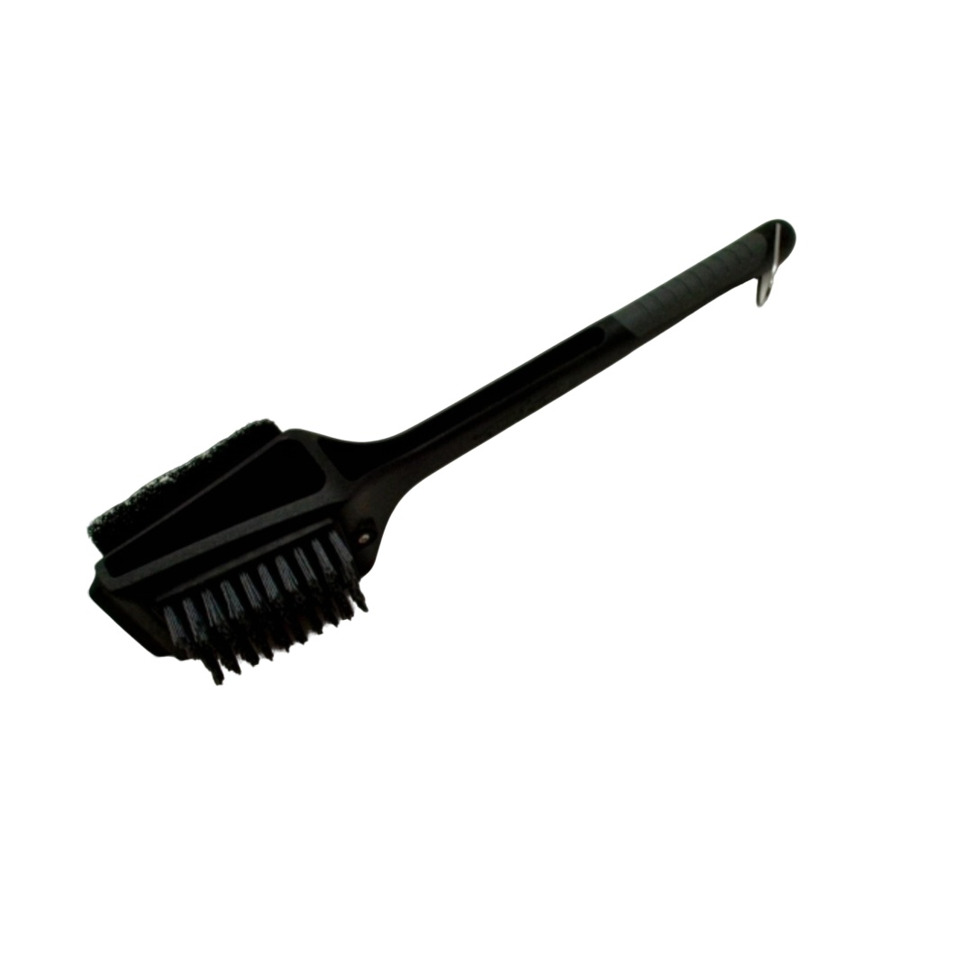 The Char-Griller 3-in-1 Grill Brush is the ultimate cleaning tool for your grill. It gives you the ability to brush, scrub and scrape All-in-One. Featuring a modern design, heavy-duty scouring pad on one side and powerful, sturdy bristles on the other, a scraper at the top and a hook for easy storage. Color: Gray.