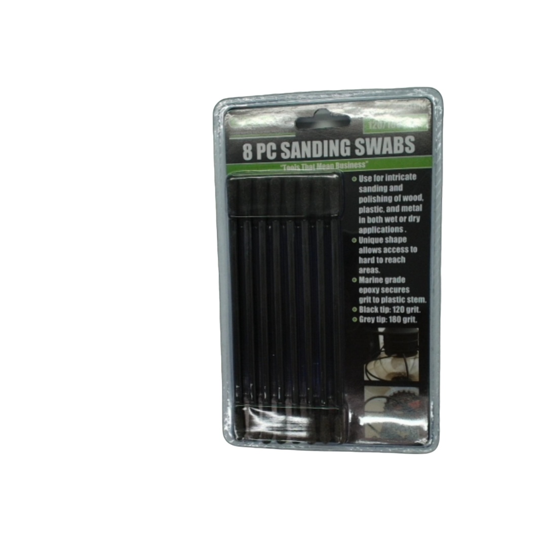 GRIP 29110 8 Piece Sanding Swab KitThis 8 piece sanding swab kit from GRIP provides an easy and convenient way to sand polish smooth and remove rust paint tarnish or corrosion. These swabs are disposable and their unique shape and plastic stems allow you to reach small spaces ordinary sandpaper or files simply can t. These sand swabs can be used on wood metal or plastics.Features:? Use for intricate sanding and polishing of wood plastic and metal in both wet or dry applications.? Unique shape allows access to hard to reach areas.? Marine grade epoxy secures grit to plastic stem.? Black tip: 120 grit. Grey tip: 180 grit.